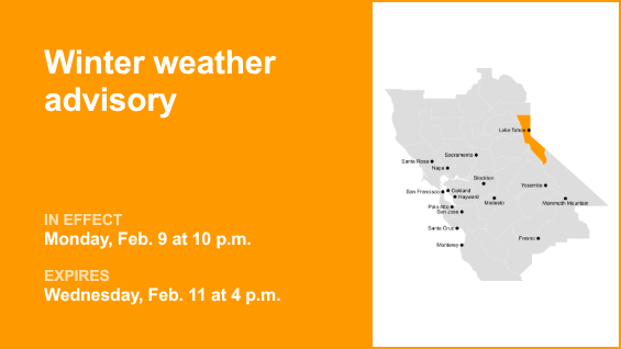El Servicio Meteorológico Nacional emitió un aviso de clima invernal a las 11:44 a. m. del domingo para el área del Gran Lago Tahoe desde las 10 a. m. de lunes a miércoles 11 de febrero, a las 4 p. m.