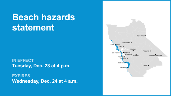 La costa nacional de Point Reyes, la costa de la península de San Francisco, el norte de la bahía de Monterey y el sur de la bahía de Monterey y la costa de Big Sur, así como el condado de San Francisco, están bajo una declaración de peligro de playa emitida por el Servicio Meteorológico Nacional a las 4:28 a.m. del martes. El comunicado es válido de 4:28 a. m. a 4 p. m. Miércoles.