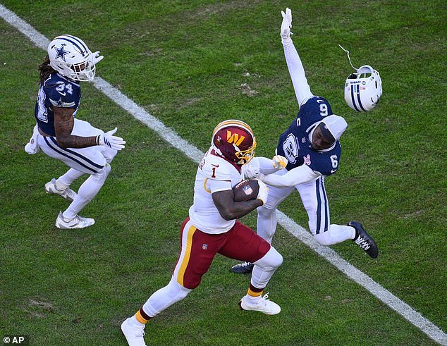 El safety de los Cowboys, Donovan Wilson, perdió su casco después de una brutal colisión en el campo con la estrella de Commander, Debo Samuel.