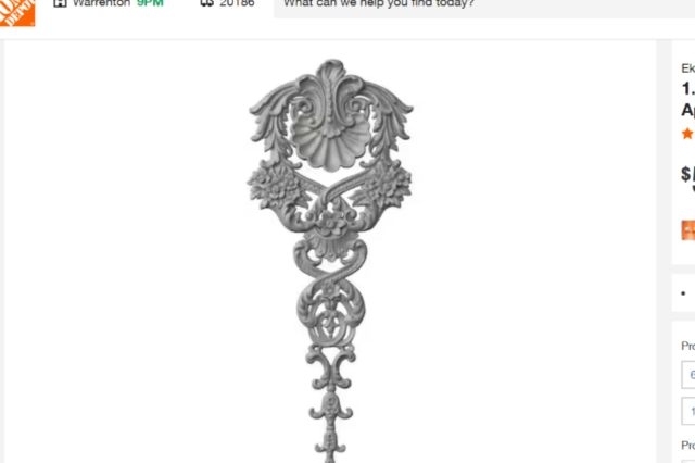 La carpintería similar publicada en el sitio web de Home Depot mide 1,13 x 14,75 pulgadas x 35,375 pulgadas. Una revisión de junio de productos de moldura para apliques y revestimientos de poliuretano.: «¡Estos moldes son impresionantes! Totalmente impresionantes. Las mejores molduras que existen. Si hay alguna moldura que poner, esta es la moldura. Todos los demás moldes son horribles… A este, lo pintas con aerosol dorado y tienes el mejor molde».