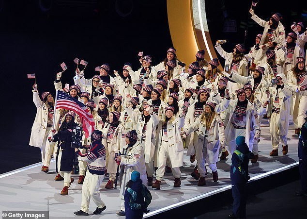 El equipo de EE. UU. estaba encabezado por los abanderados Erin Jackson, una patinadora de velocidad, y Frankie Del Luca, parte del equipo nacional de bobsleigh, cuando entraron al estadio.