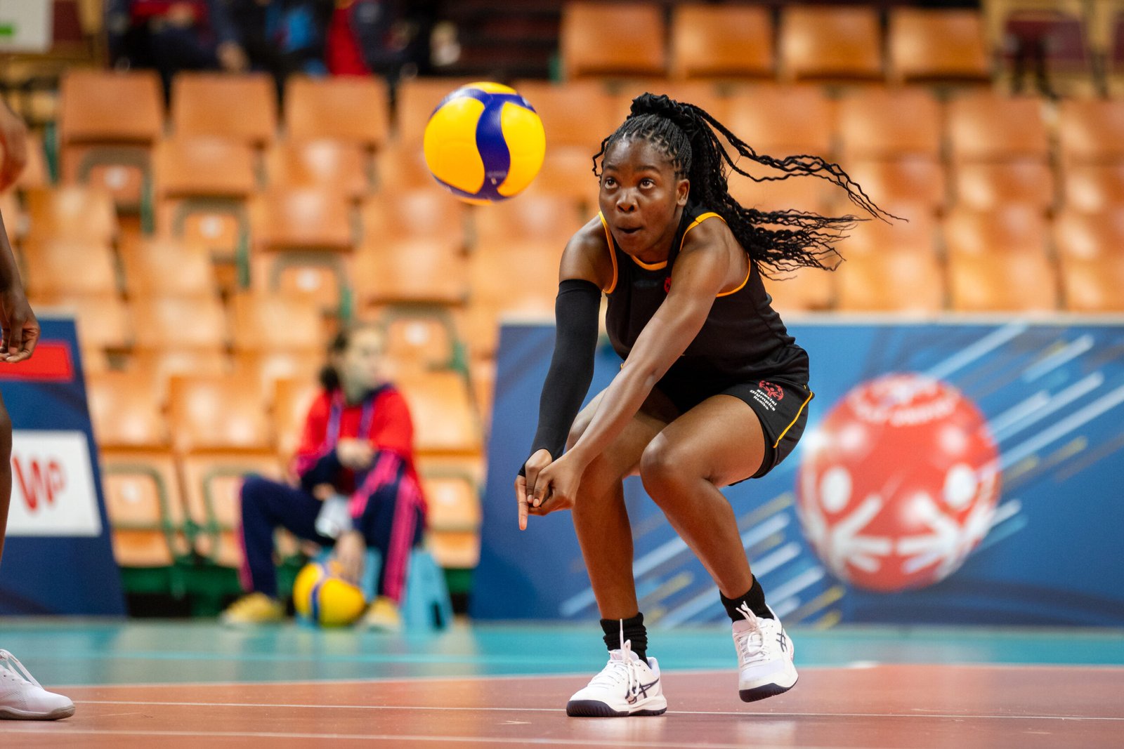 Los jugadores de voleibol olímpicos olímpicos de Namibia especiales pasan una pelota en las Olímpicas Especiales de Baloncesto Unificado de Baloncesto Mundial Polonia 2025.
