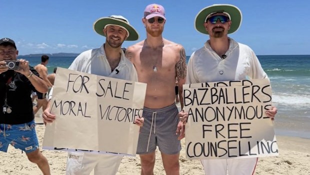 Stokes fue fotografiado junto a dos hombres vestidos completamente de blanco de cricket, sosteniendo carteles burlándose de los problemas del equipo en las dos primeras pruebas.