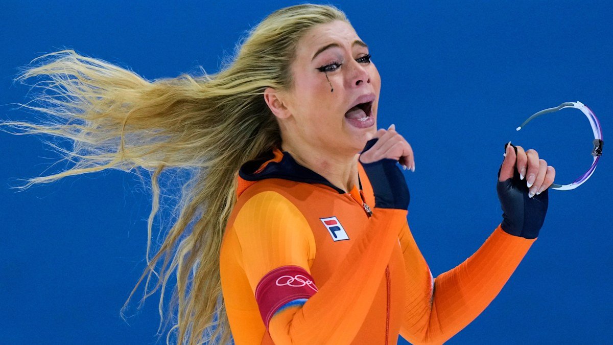 Jutta Leerdam celebra haber ganado el oro en los Juegos Olímpicos. AP