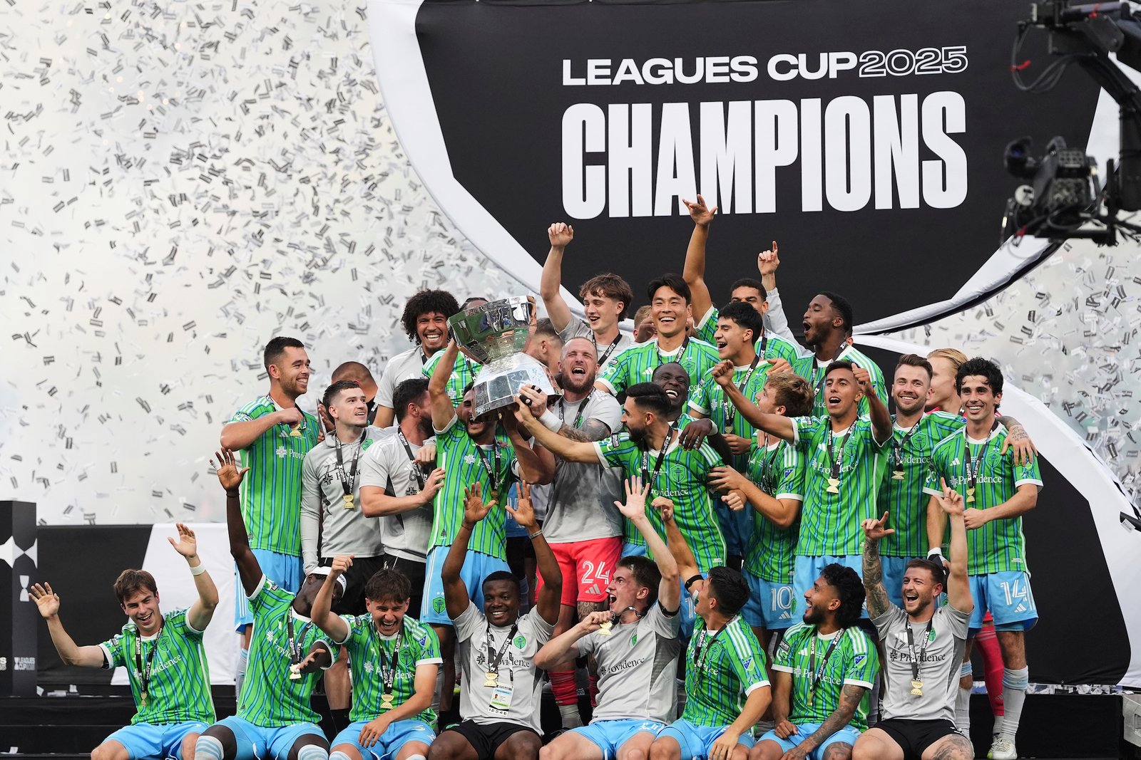 El domingo 31 de agosto de 2025, los Seattle Sounders levantaron el trofeo en Seattle, que la Copa de la Liga venció a Miami en el último partido de fútbol. (AP Photo/Lindsay Vasan)