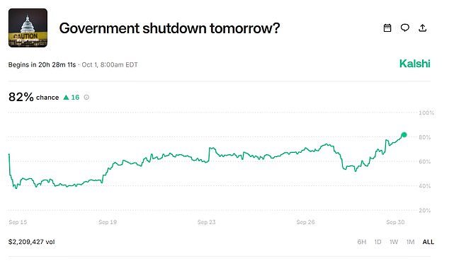 Las posibilidades de cierre en el mercado de predicciones fueron de hasta un 84 % esta mañana antes de regresar esta mañana. Esto significa que cada apuesta de $ 100 en el cierre del gobierno, Betters gana $ 20, gana $ 489 contra el cierre.