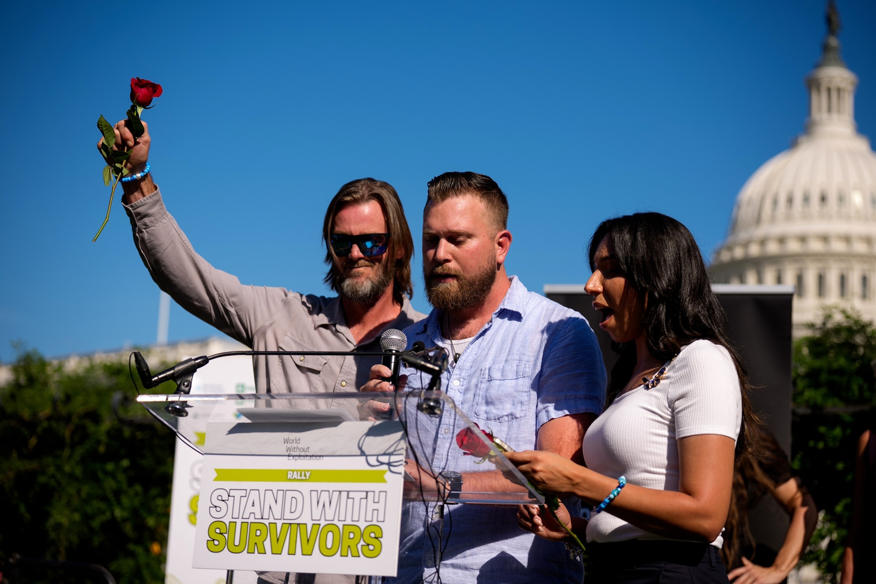 Familiares de Virginia Giuffre hablan durante una manifestación en apoyo de las víctimas del financiero y traficante sexual caído en desgracia Jeffrey Epstein frente al Capitolio de los Estados Unidos el 3 de septiembre de 2025 en Washington, DC