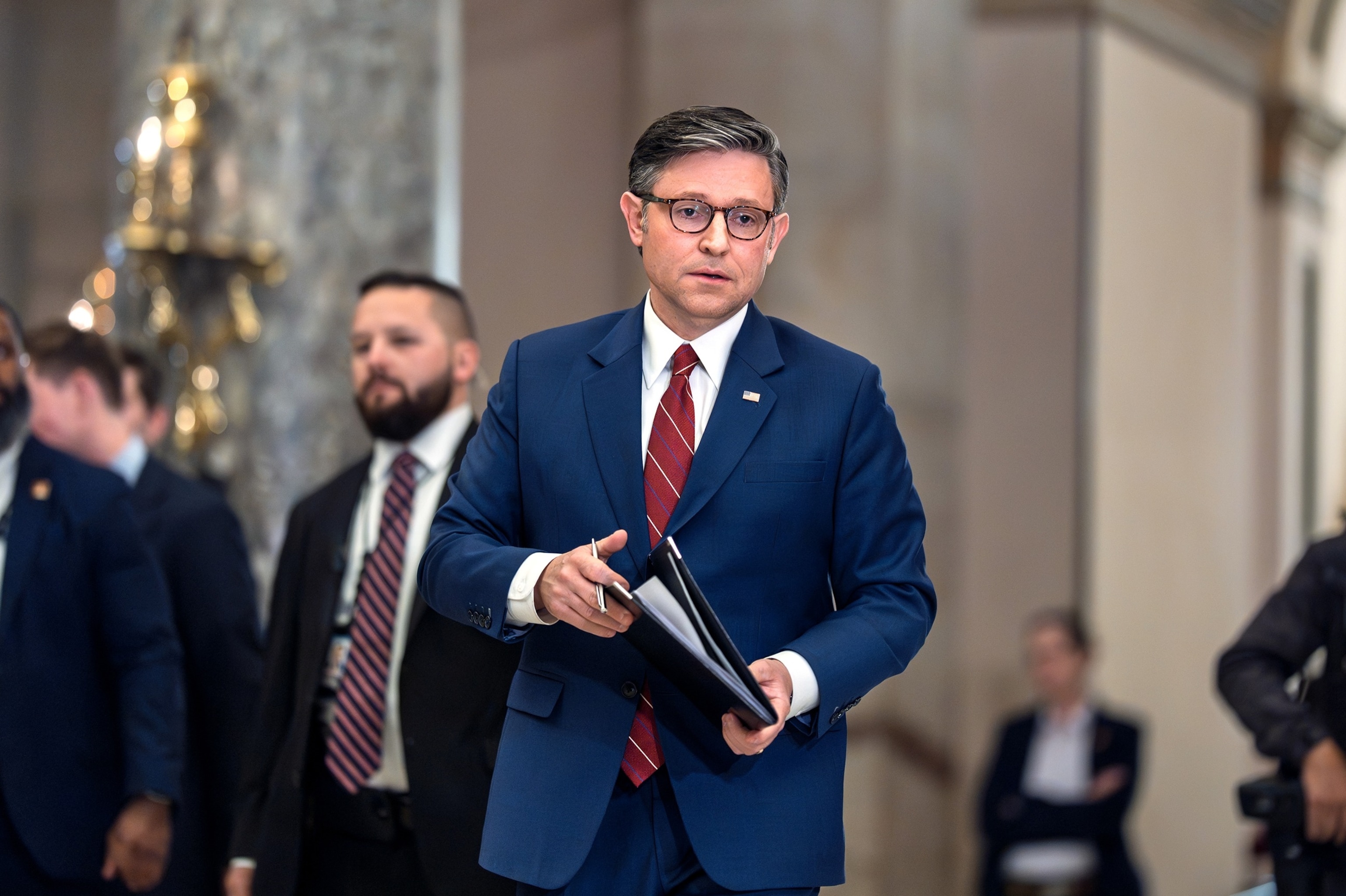 El presidente de la Cámara de Representantes, Mike Johnson, sale de la cámara para hablar con los periodistas después de la votación final para poner fin al cierre gubernamental más largo de la historia el 12 de noviembre de 2025 en el Capitolio de Washington, DC.