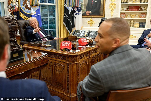 Donald Trump publicó una foto de las negociaciones de cierre del gobierno en las que los sombreros ‘Trump 2028’ le dieron líderes demócratas