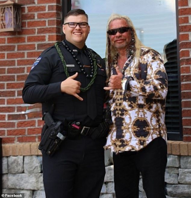 Dog the Bounty Hunter Star Duwan Chapman, de 72 años, hijo del oficial de policía, Gary Chapman, de 24 años, fue retirado por su participación en un accidente mortal de un adolescente muerto; Chapman retrató con su padre en la graduación policial en Alabama