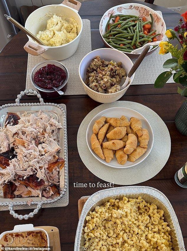 Leavitt muestra el arreglo de su familia para el Día de Acción de Gracias y su esposo cortando un pavo