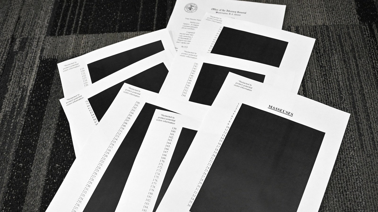 Esta ilustración fotográfica tomada en Washington el 19 de diciembre de 2025 muestra documentos redactados después de que el Departamento de Justicia de Estados Unidos comenzara a publicar registros tan esperados.