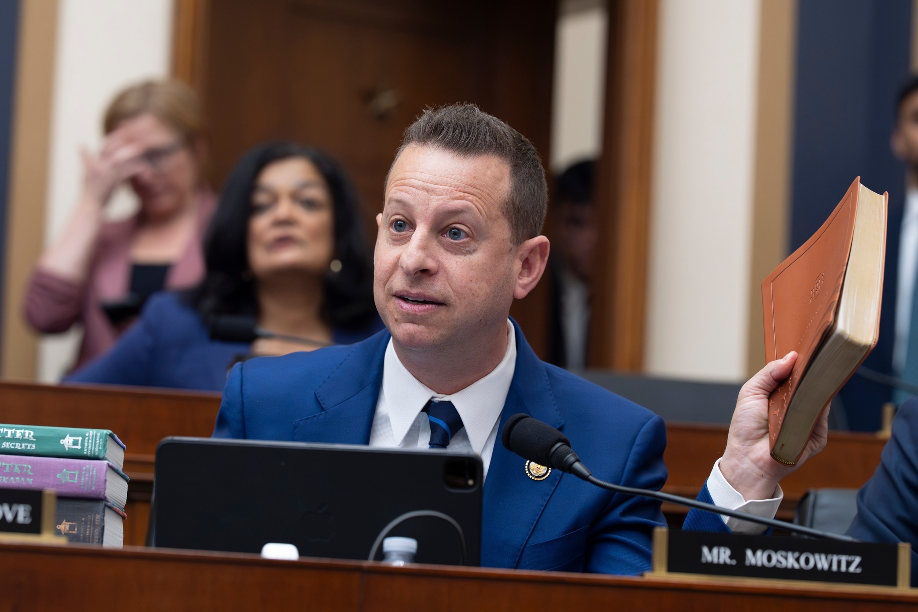 El representante Jared Moskowitz sostiene una Biblia de Trump mientras interroga a la fiscal general Pam Bondi ante el Comité Judicial de la Cámara de Representantes en el Capitolio el 11 de febrero de 2026.