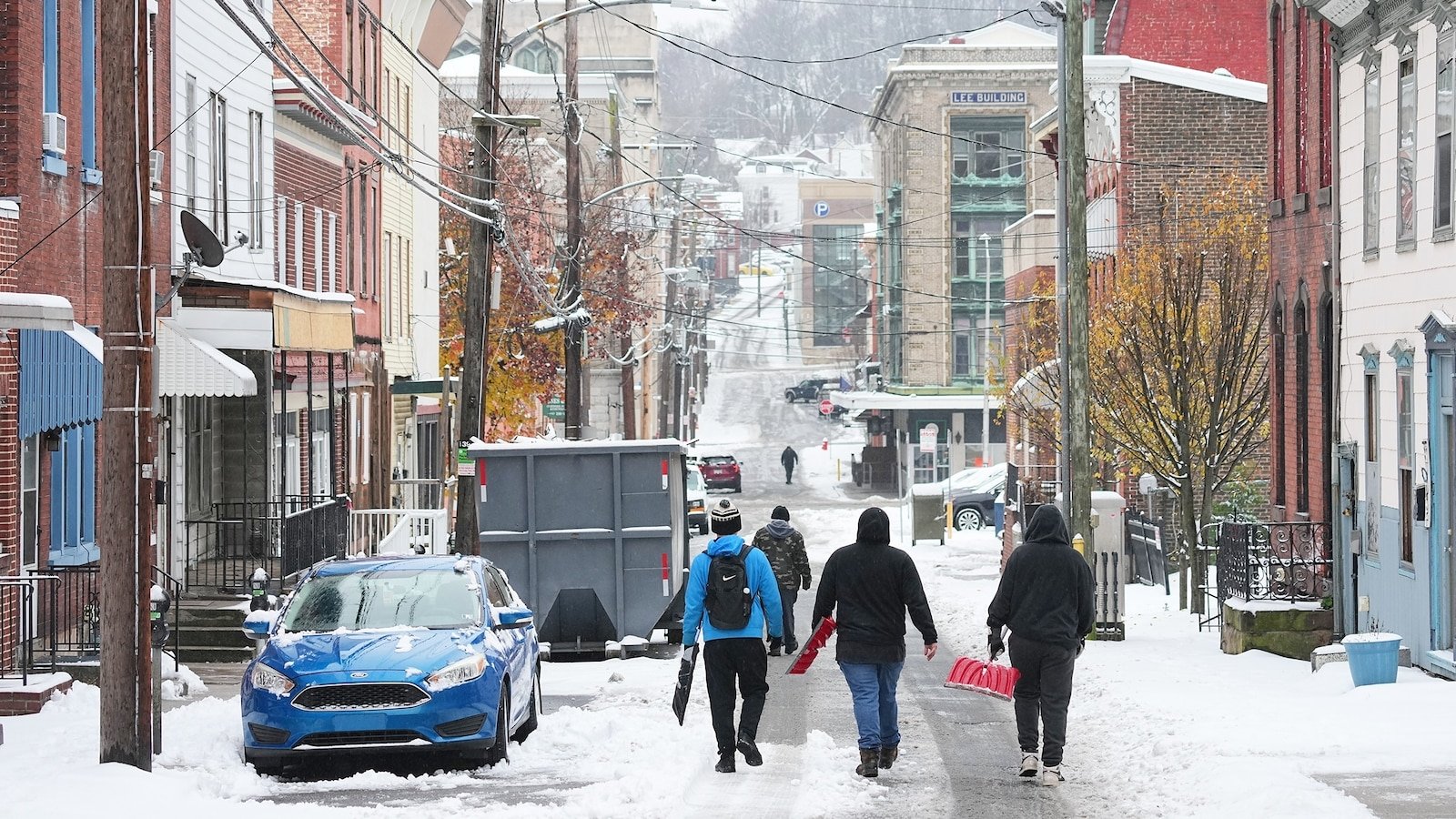 La gente camina por calles polvorientas después de una tormenta de nieve invernal en Pottsville el 2 de diciembre de 2025.
