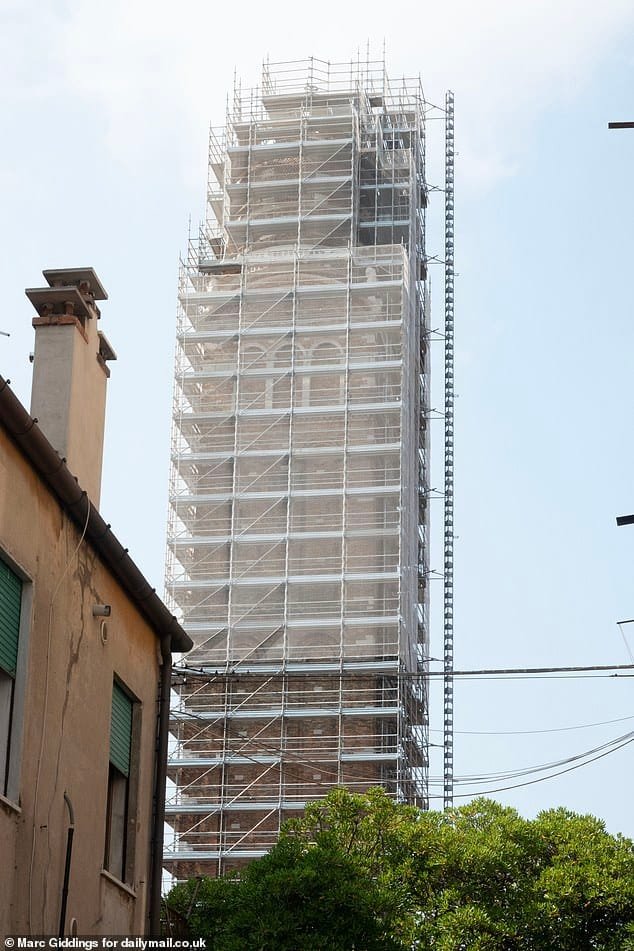 Cuando los invitados llegan por primera vez, ven el icónico campanario cubierto en el andamio