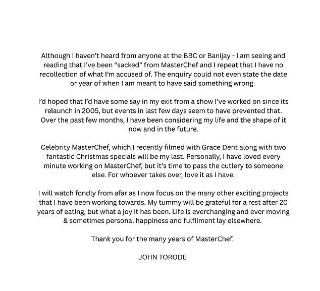 «El asunto fue discutido oficialmente con John Torod por Banizay UK, y John había defendido la queja de Louis Silkin, a pesar de que John había dicho que no había recordado el incidente. Banizay admitió que su acuerdo no podía renovarse contra el Reino Unido y la BBC Masterchef.»