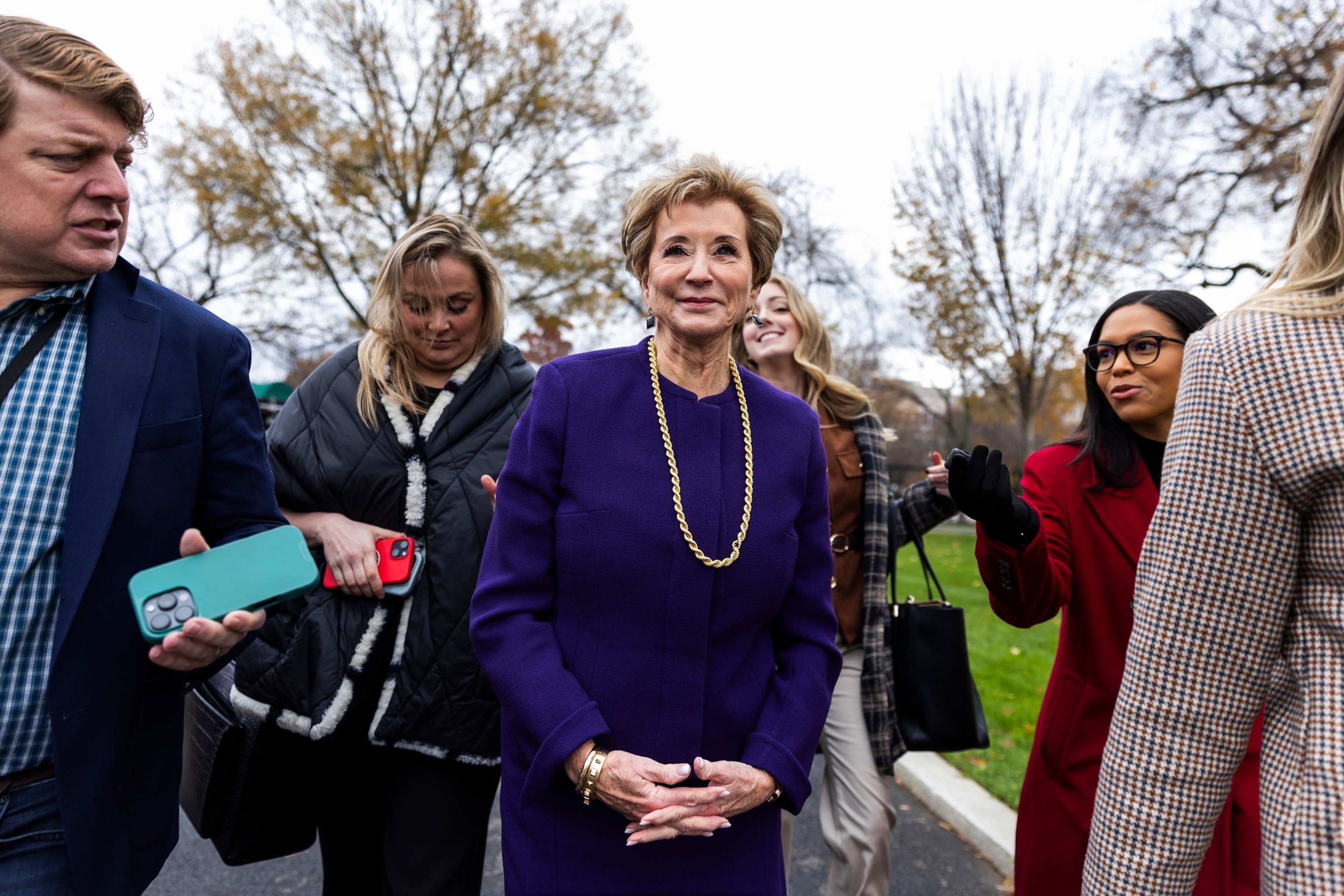 La secretaria de Educación, Linda McMahon, habla con los periodistas frente a la Casa Blanca en Washington el 19 de noviembre de 2025.
