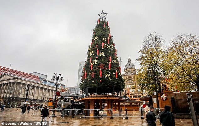 Se ha colocado un árbol cívico frente a las oficinas del Ayuntamiento de Birmingham, mientras que también se están instalando puestos de mercado para la temporada festiva.