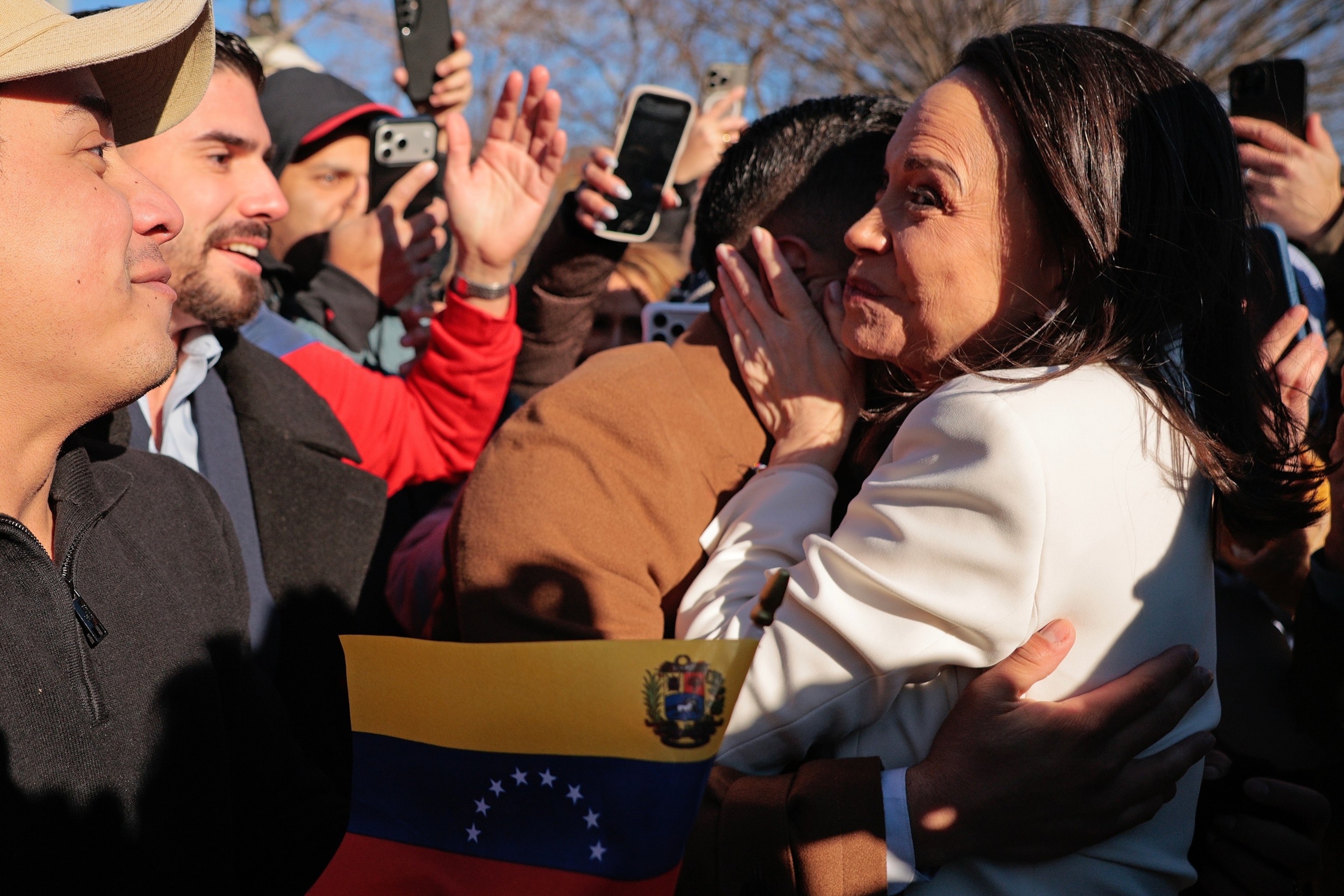La líder de la oposición venezolana María Corina Machado saluda a sus partidarios en la Avenida Pennsylvania, cerca de la Casa Blanca, después de reunirse con el presidente Donald Trump el 15 de enero de 2026 en Washington.