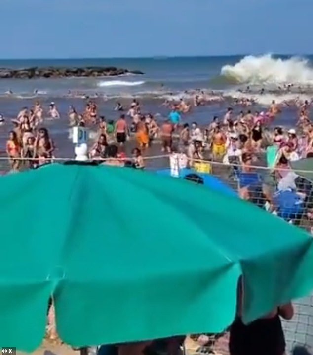 En un dramático clip filmado el lunes por la tarde en la ciudad costera de Santa Clara del Mar, se pueden ver rápidas oleadas en una playa abarrotada mientras la gente sale del agua para ponerse a salvo en la arena.
