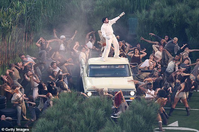 Los manifestantes agitaron pancartas que decían ‘ICE OUT’ en un guiño a la declaración política de Bad Bunny en su discurso en los Grammy después de ganar el álbum del año la semana pasada. (En la foto: Bad Bunny actúa en el espectáculo de medio tiempo del Super Bowl LX en San José el domingo por la noche)