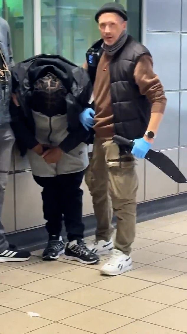 El momento después de enterarse de que la Policía de Transporte Británica (BTP) llevaba a dos jóvenes que llevaban cuchillas de terror en el área subterránea de la estación ayer por la tarde.