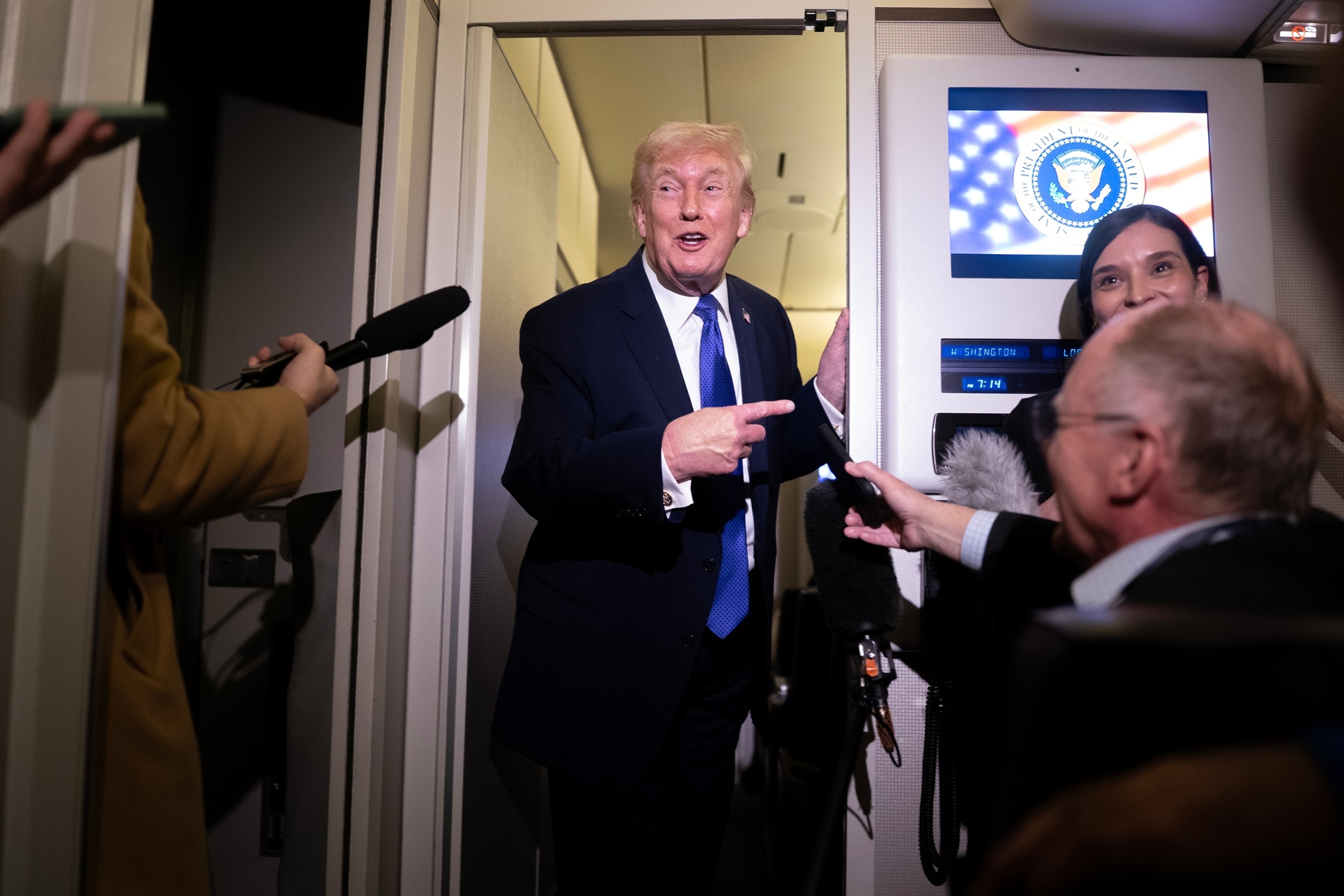 Donald Trump habla con los miembros de los medios a bordo del Air Force One mientras despega del Aeropuerto Internacional de Palm Beach hacia Washington, DC el 16 de febrero de 2026.
