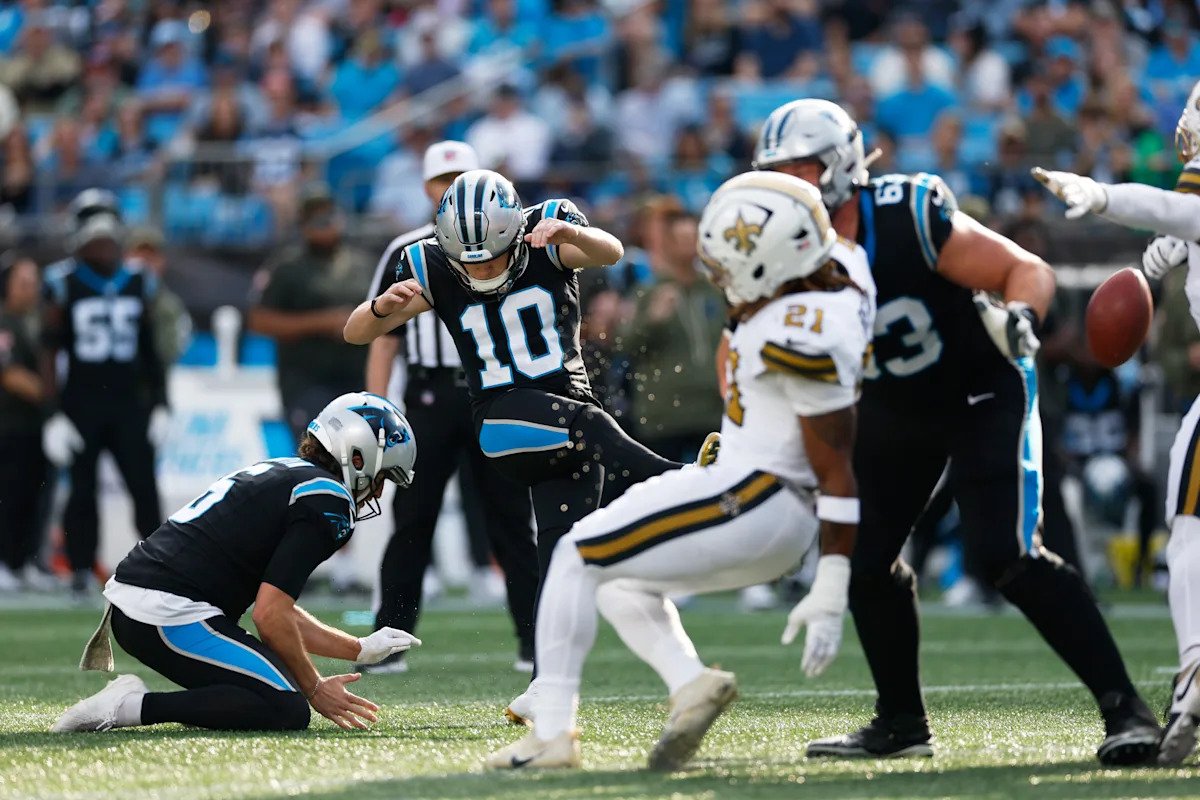 Los New Orleans Saints bloquearon un intento de gol de campo del pateador de los Panthers, Ryan Fitzgerald, el domingo. Pero los Panthers pudieron recuperar el balón en el juego y lograr nuevas oportunidades.
