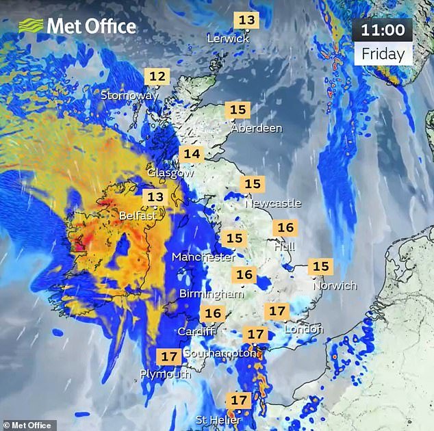 Continuó: «Los vientos se reducirán a la mayoría de las partes hasta el sábado por la tarde, pero antes del final del norte de las Islas Norte y el norte de Escocia, hasta el final del sábado, antes de relajarse durante la noche».