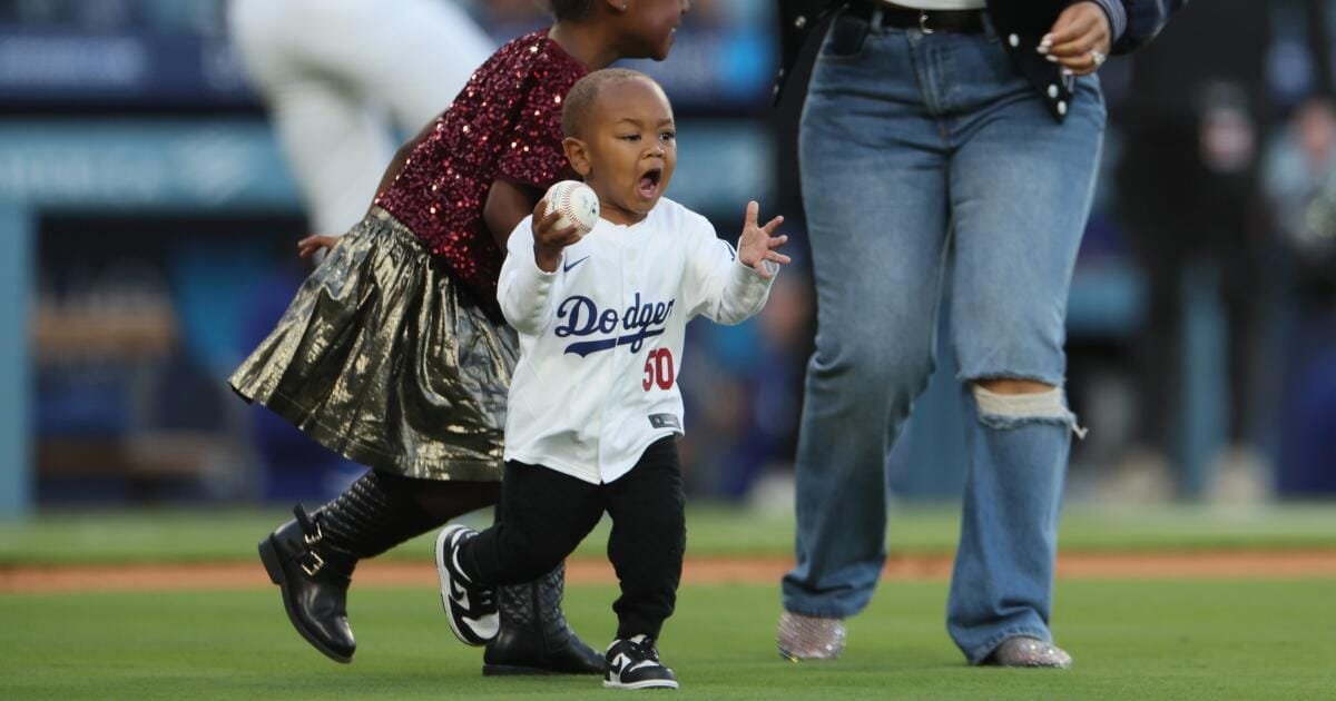 Los Dodgers Iel Tfilder Moki Betts de 2 -Year -dold’s hijo lanzó un primer lanzamiento ritual en H.Padre’s Bob Headnight En el Dodger Stadium el martes, pero no antes de dar un descanso para el campo derecho con el balón.