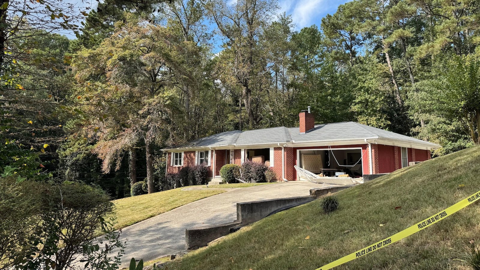 Después de que los jardineros fueron detenidos, el garaje de ladrillo de la casa se derrumbó dentro de la puerta y la policía bloqueó el paso. La casa está ubicada en un barrio al lado de Tyler Perry Studios, uno de los cineastas más grandes del país.