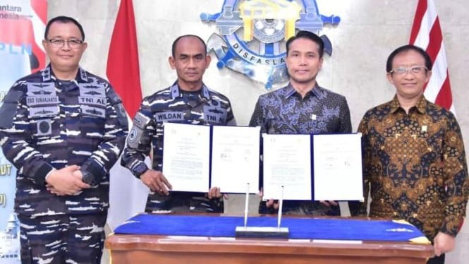 Descripción de la foto: La firma de los PK entre la Armada de Indonesia que representa al Kadispaslanal, el primer almirante TNI ESEP Wildan (desde la izquierda hasta la segunda) representó la Java Oriental con la GM PLN UID Java que representa a la Java Oriental, la segunda (9/17) (9/17) (9/17).