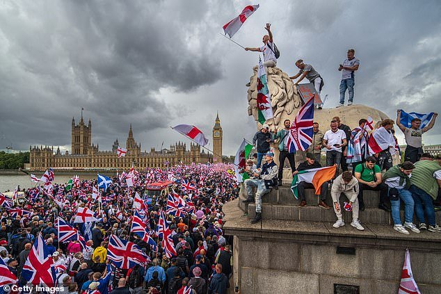 Alrededor de 150,000 manifestantes, muchos de los cuales estaban cubiertos de banderas de San Jorge, y detuvieron a Londres cuando la crisis de la migración pasaba por las calles de la capital.