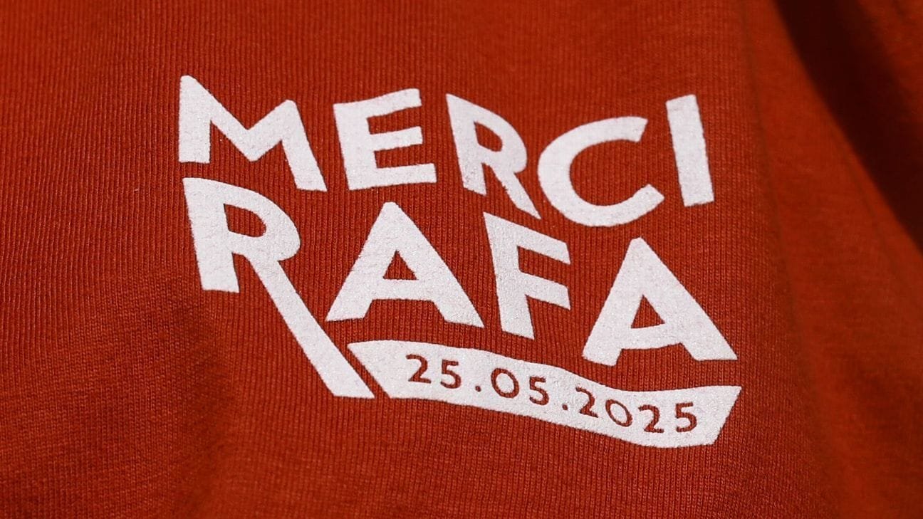Los fanáticos que asistieron a la corte en la corte en Philip-Chatter para celebrar el campeón del Abierto de Francia 14 veces, que fueron identificados por la frase francesa a la frase francesa «gracias Rafa» y «25.05.2025». Las camisetas distribuidas en diferentes tonos de suelo son parte de un tributo de coordinación. Se pidió a los fanáticos que los usaran, creando un gran mosaico en las gradas que afirman ser «RG14» – Los 14 títulos de Nadal en París.