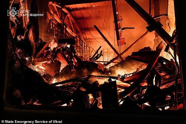 La llama aparece en una instalación comercial destruida en Jharkiv, Ucrania, después de que el aire ruso ataca anoche