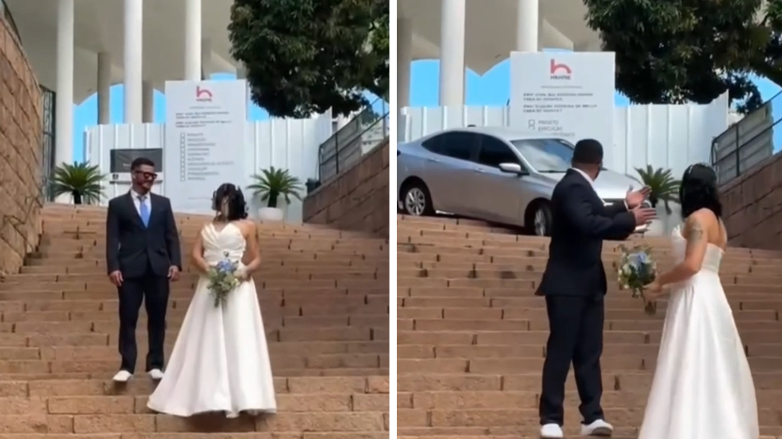 Jack Amorim Y fuente de neres Filmada a mitad de camino en las escaleras de la Catedral de San Pablo Apóstol en Blumenau, Brasil (todo risas, todo romance), un conductor accidentalmente decide tomar un giro muy equivocado y conducir un sedán por las escaleras detrás de él.